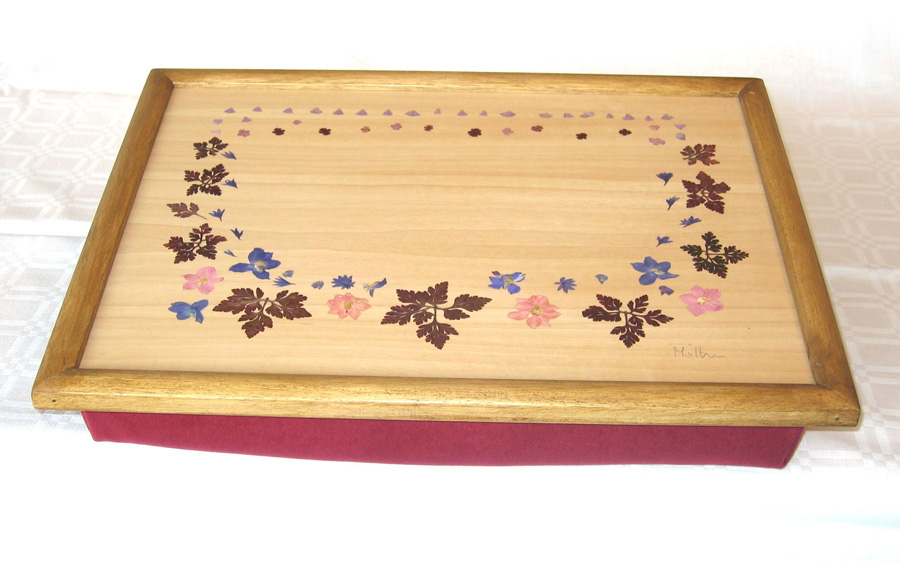 vassoio "LOBELIA" in legno naturale, composizione con fiori veri essiccati, colori naturali, cuscino verde |