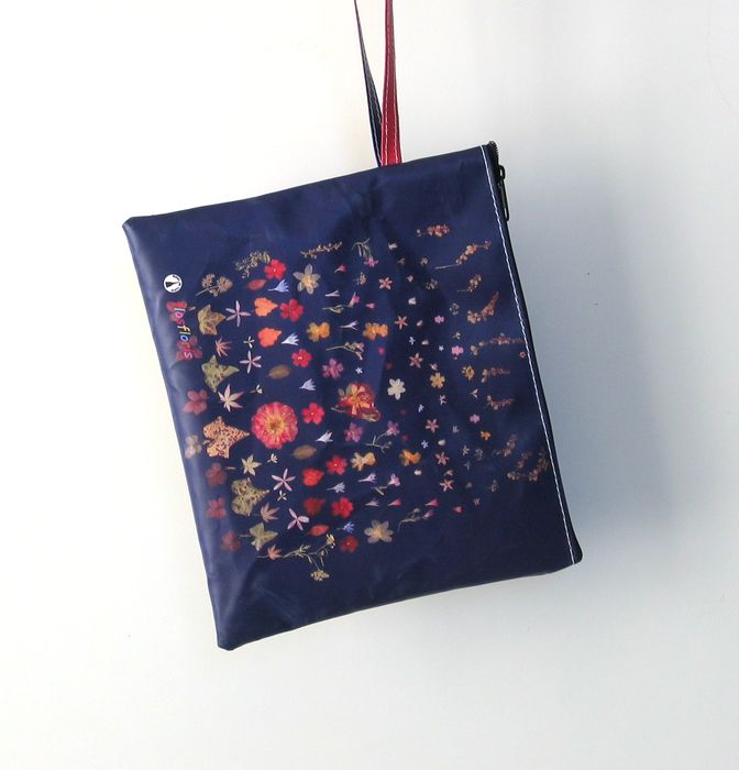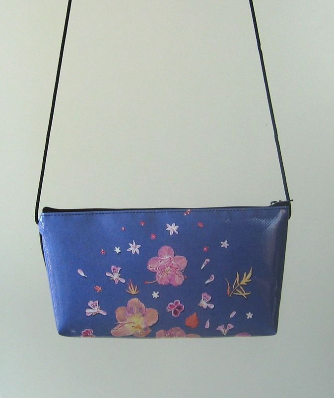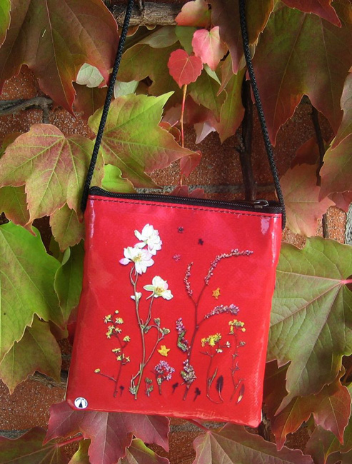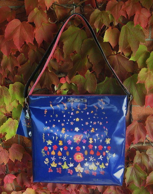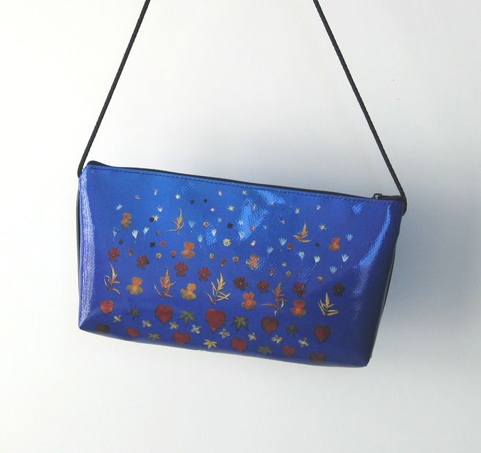 bag mod. CITY Q - D (shoulder belt + zip closure), image of composition created with dried flowers (natural colors) "FIORI ROSSI E FOGLIE EDERA SU FONDO BLU" (comp. 060) |