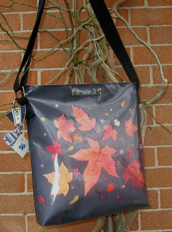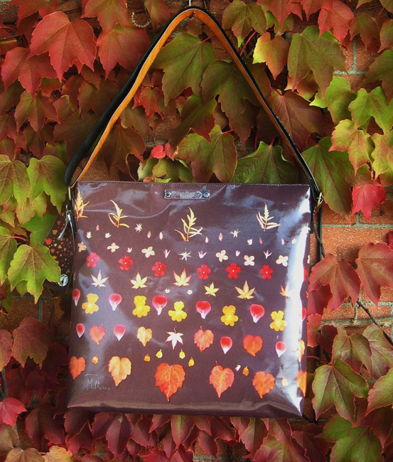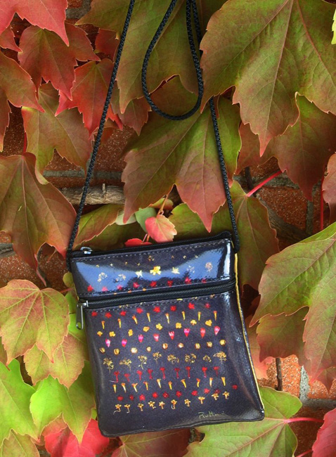 bag mod. MINI CITY Q - D (shoulder belt + zip closure), image of composition created with dried flowers (natural colors) "FOGLIE ACERO SU FONDO NERO" (comp. 073) |
