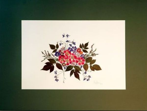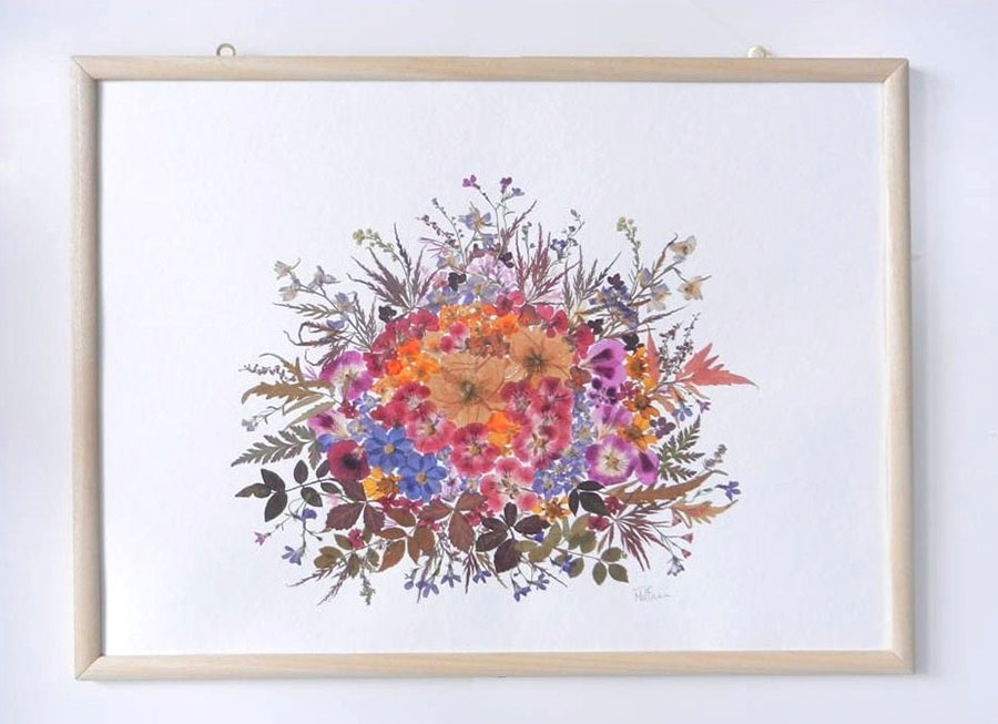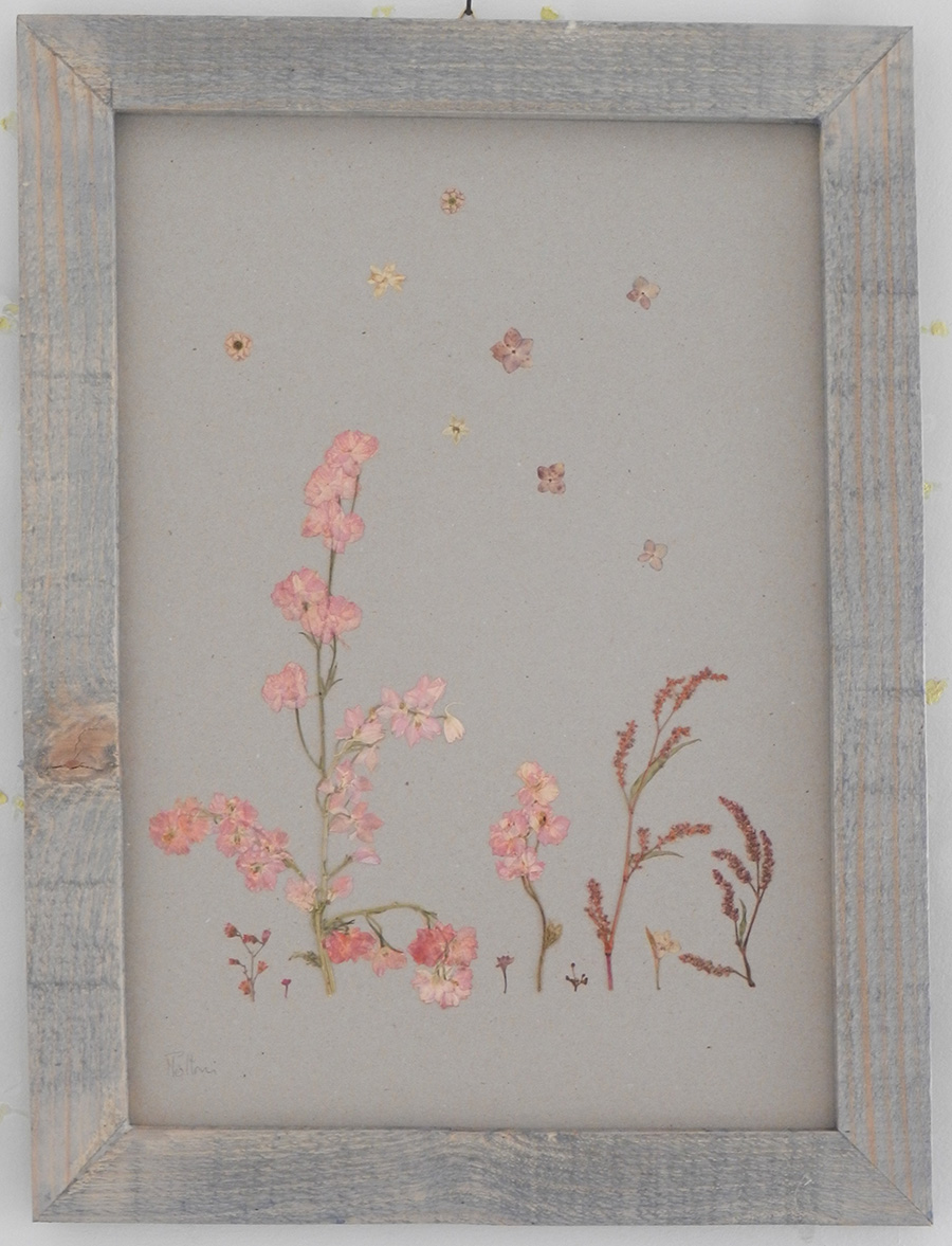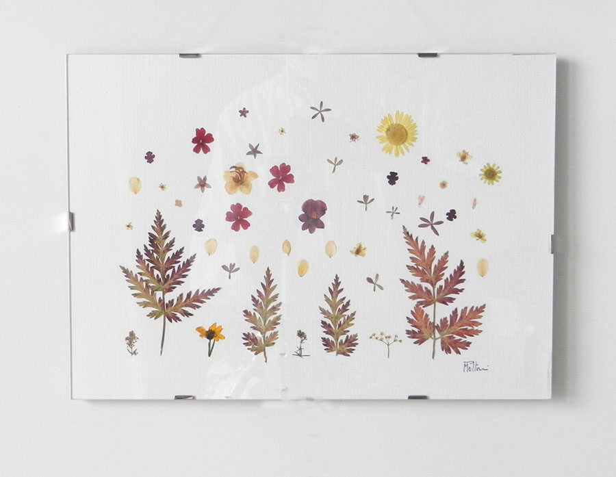 composition created with dried flowers, on a sheet of white cardboard, natural colors, in a very simple frame, no passe-partout |