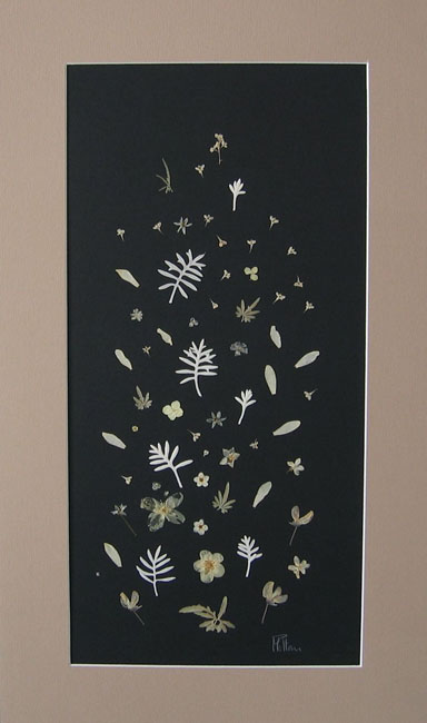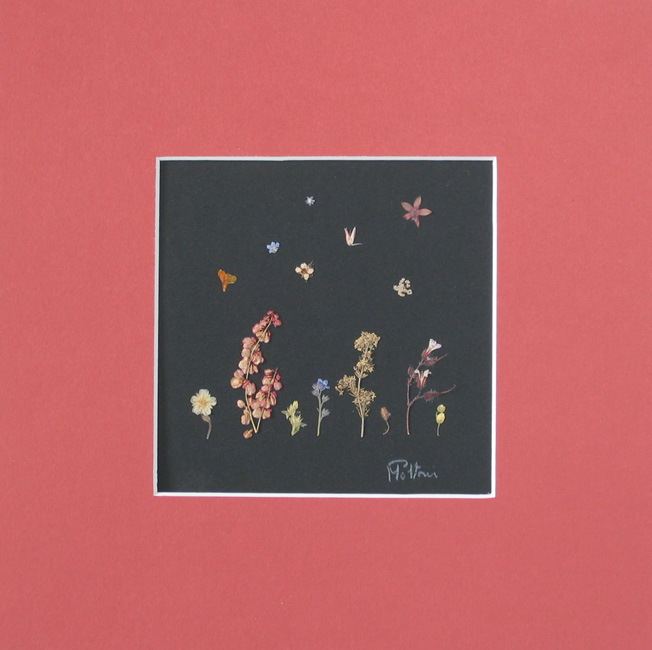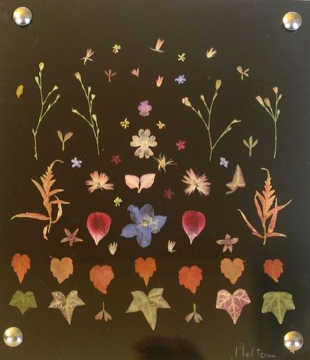 composition created with dried flowers, between two black plexiglass sheets, natural colors |