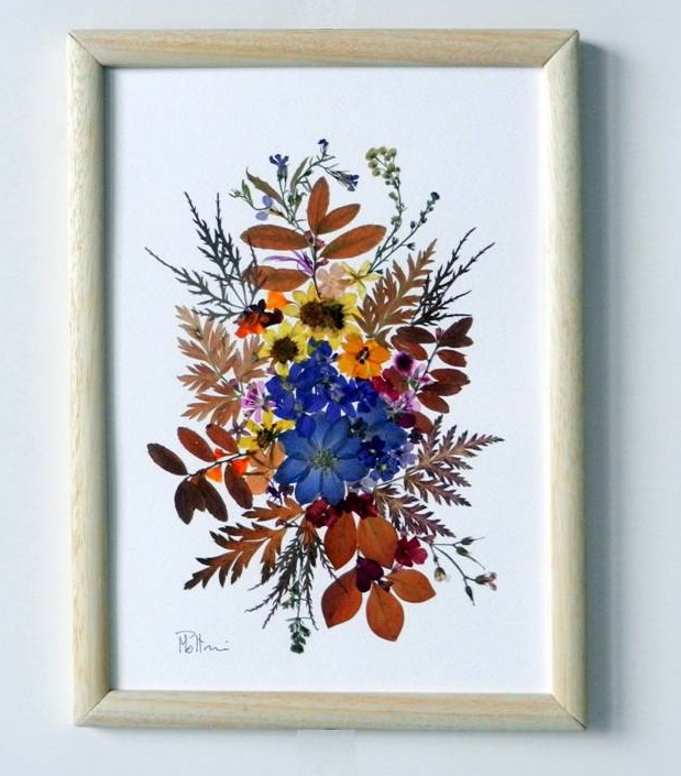 composition created with dried flowers, on a sheet of ivory cardboard, natural colors, in golden antique frame, no passe-partout, frame not included |