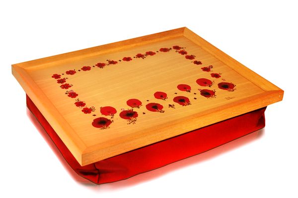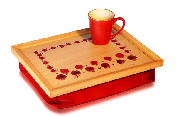 wooden lap tray "GERANI 1", composition created with dried flowers, natural colors, red cushion |