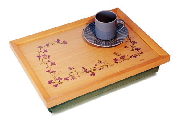 wooden lap tray "LOBELIA", composition created with dried flowers, natural colors, green cushion |