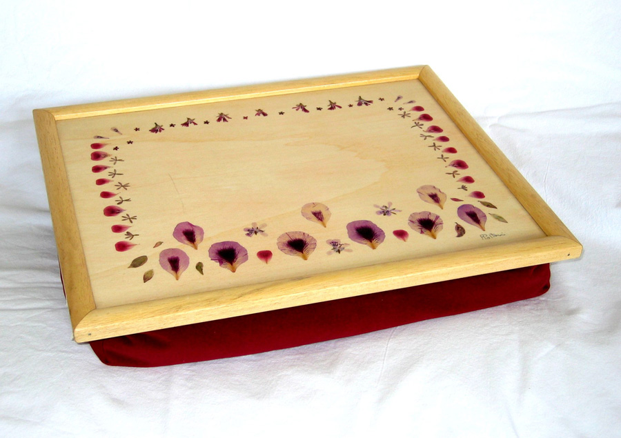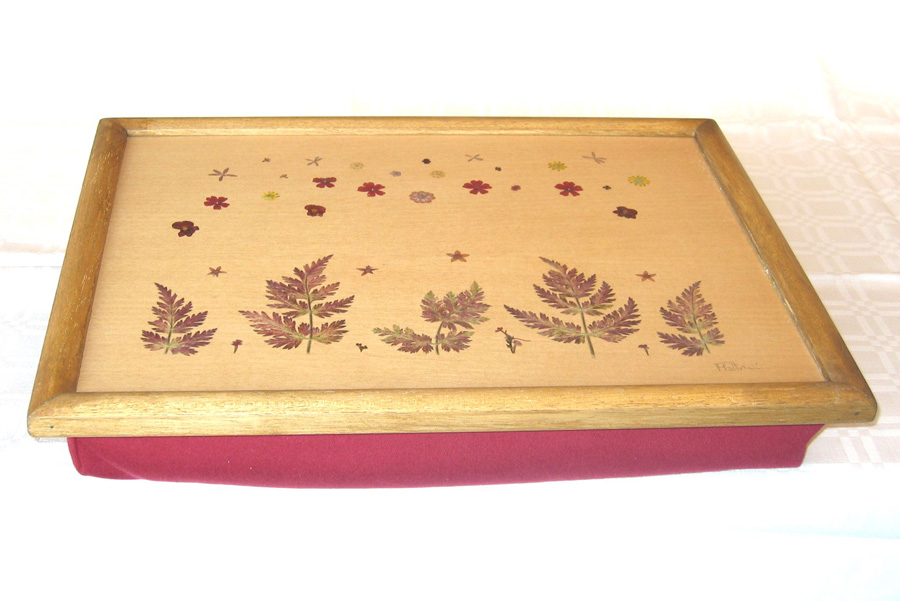 wooden lap tray "SPERONELLA", composition created with dried flowers, natural colors, red cushion |