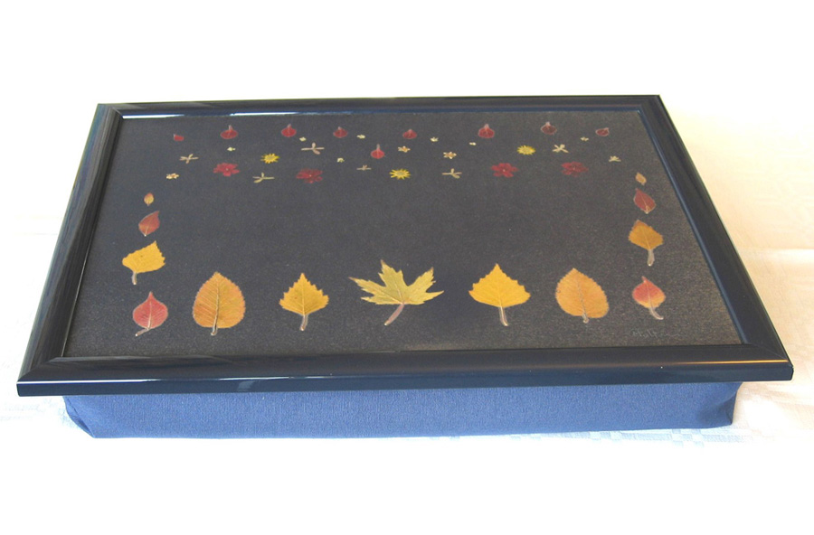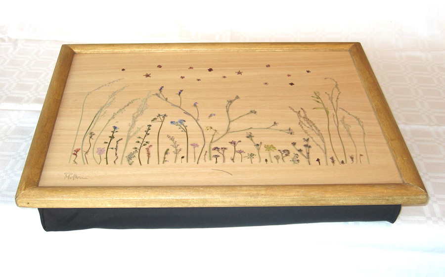 wooden lap tray "RAMETTI", composition created with dried flowers, natural colors, black cushion |