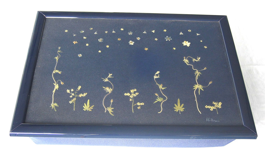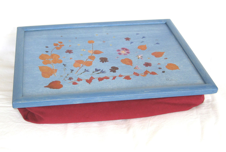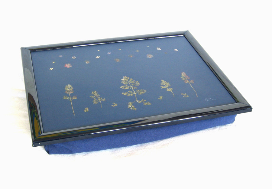 blue lap tray "ACERO", composition created with dried flowers, natural colors, blue cushion |